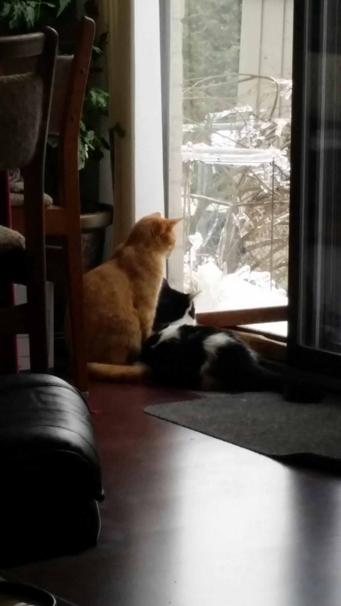 And Orion and Eevee looking outside watching their squirrel friends frolic in the iced snowy wonderland.