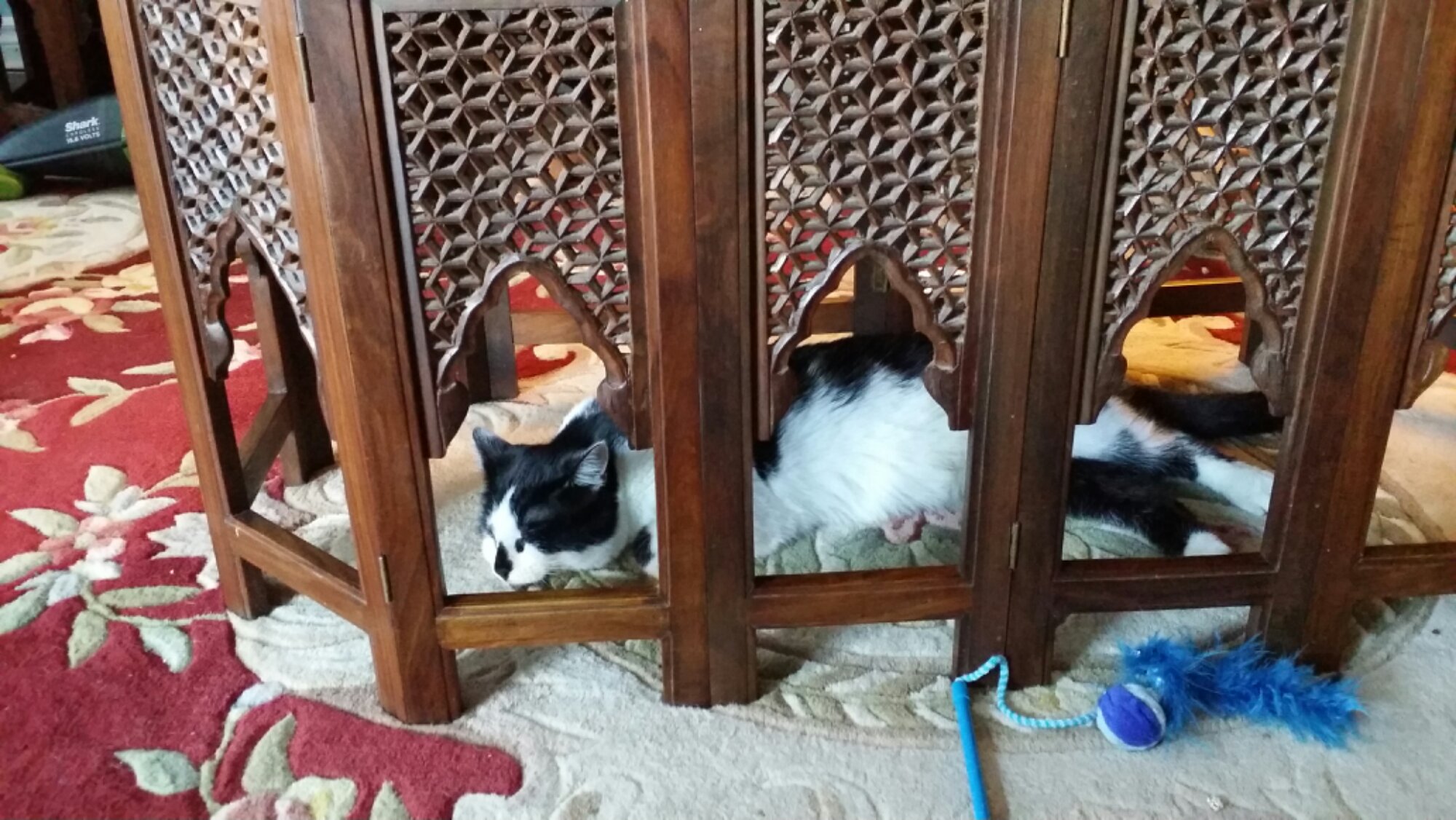 Here’s my little girl, Eevee, sleeping in her magical wooden palace. Which is actually just our coffee table. It’s hand carved. She loves hiding in there.