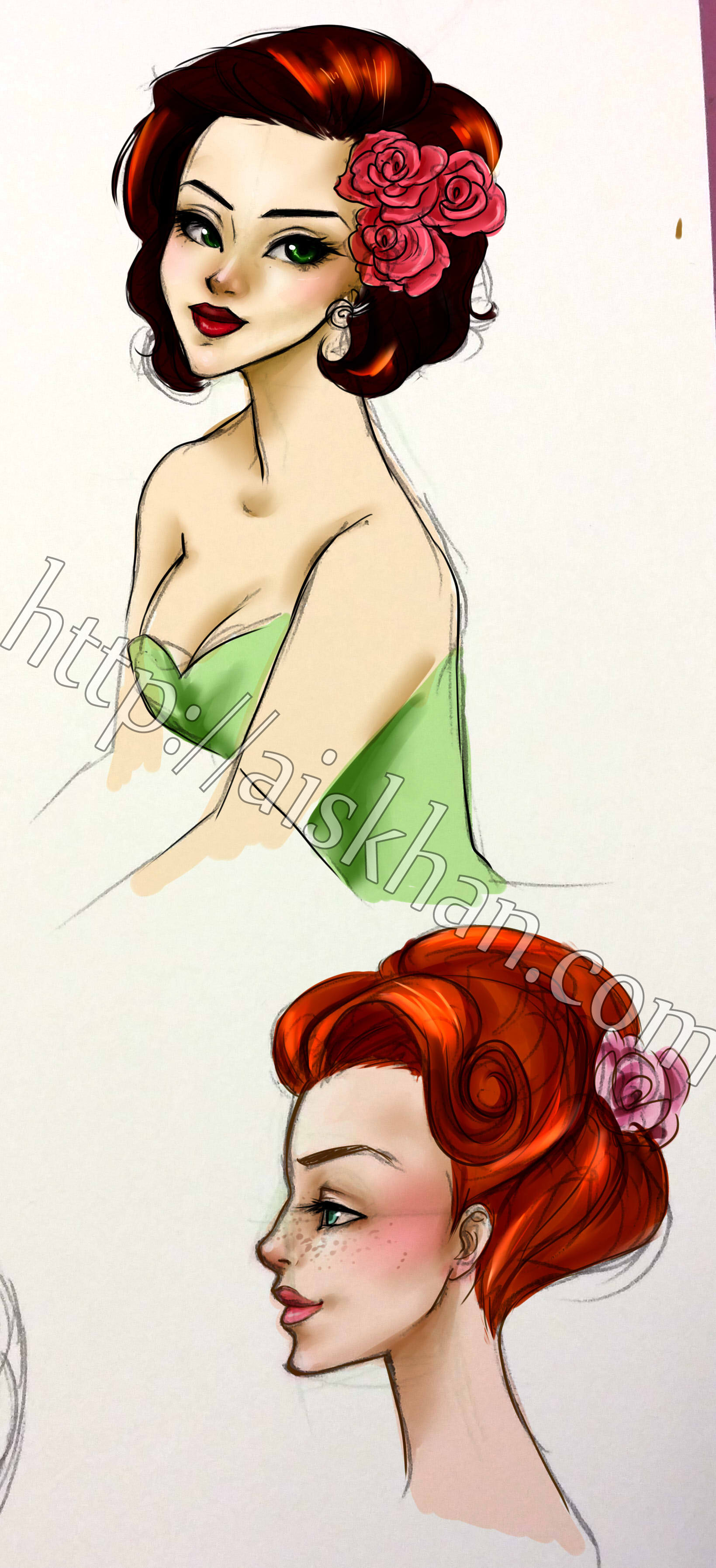 For the top lady, I think I prefer the sketch better, it’s less obvious that her eyes are slightly askew, but the red-head on the bottom