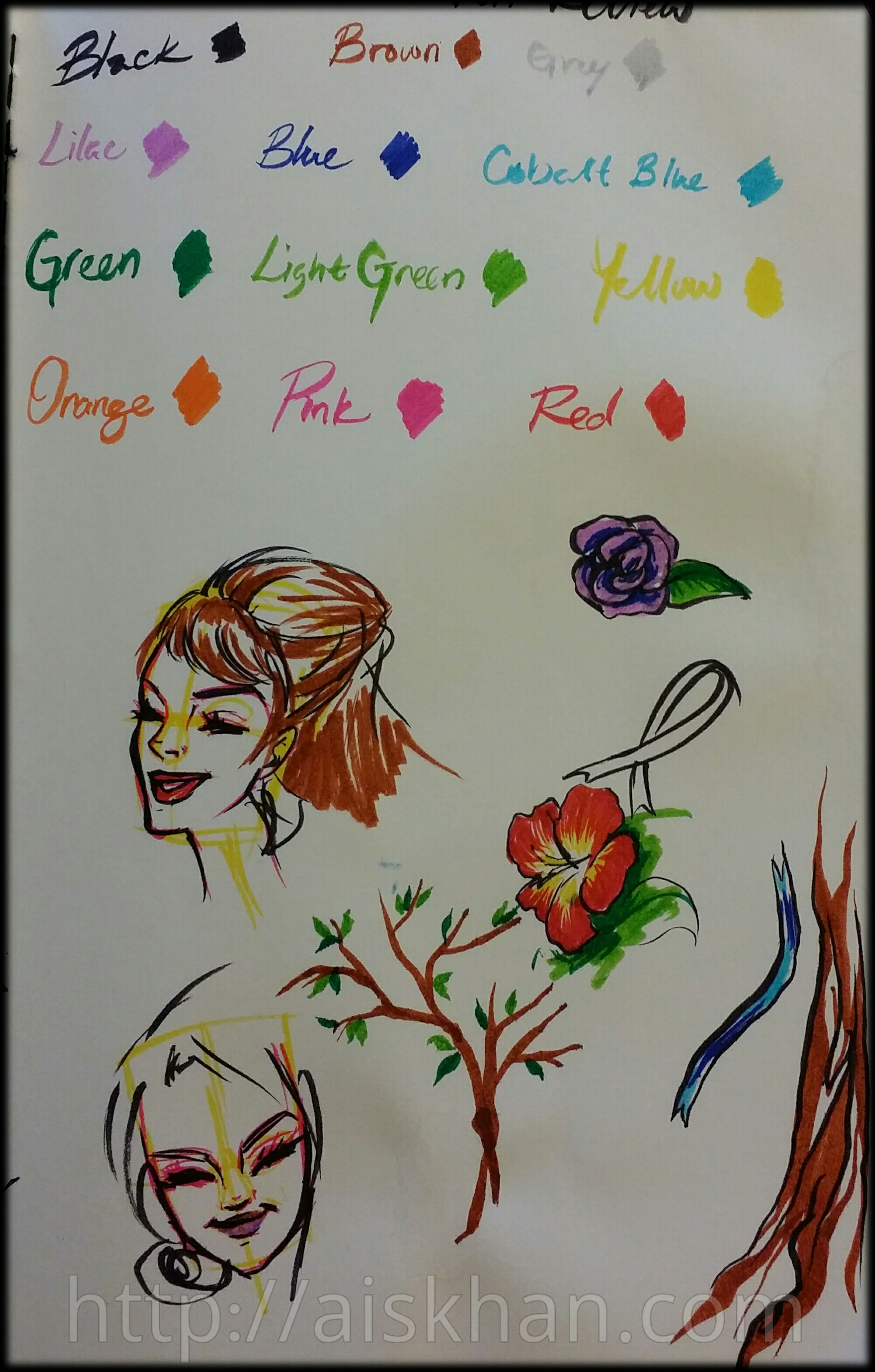 So I first swatched all the colours to see what they looked like. They have great pigment to them, are really bright and don’t appear to bleed through the paper (I used a plain moleskine notebook). Afterwards I played around with some doodles. These pens create finer lines than Pentel’s brush pen, which I like. You can see with the flowers I tried blending the colours, I learned afterwards that there was a better way to blend them. The tree branches and leaves were testing brushstrokes.