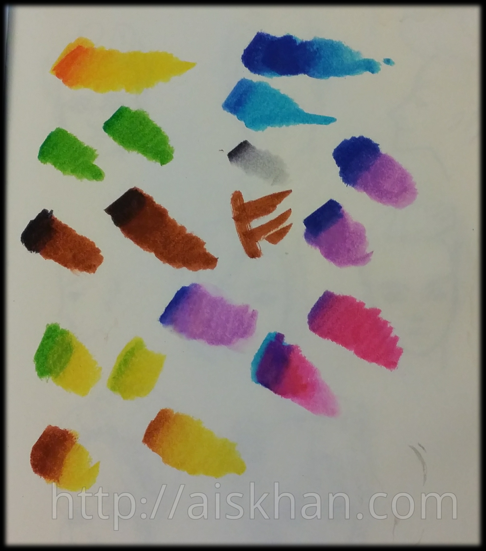 I continued my experiments with my Kuretake Brush Pens. Above, I tried blending them according to the tips on Kuretake’s website. One was painting the lighter colour over the darker colour while the ink is still wet, which left a less gradient like effect. The other was to paint the tip of the brush pen with the darker colour and then paint on the paper, which yielded a much nicer gradient (see the brown to yellow swatch, the second one on the bottom row from the left).