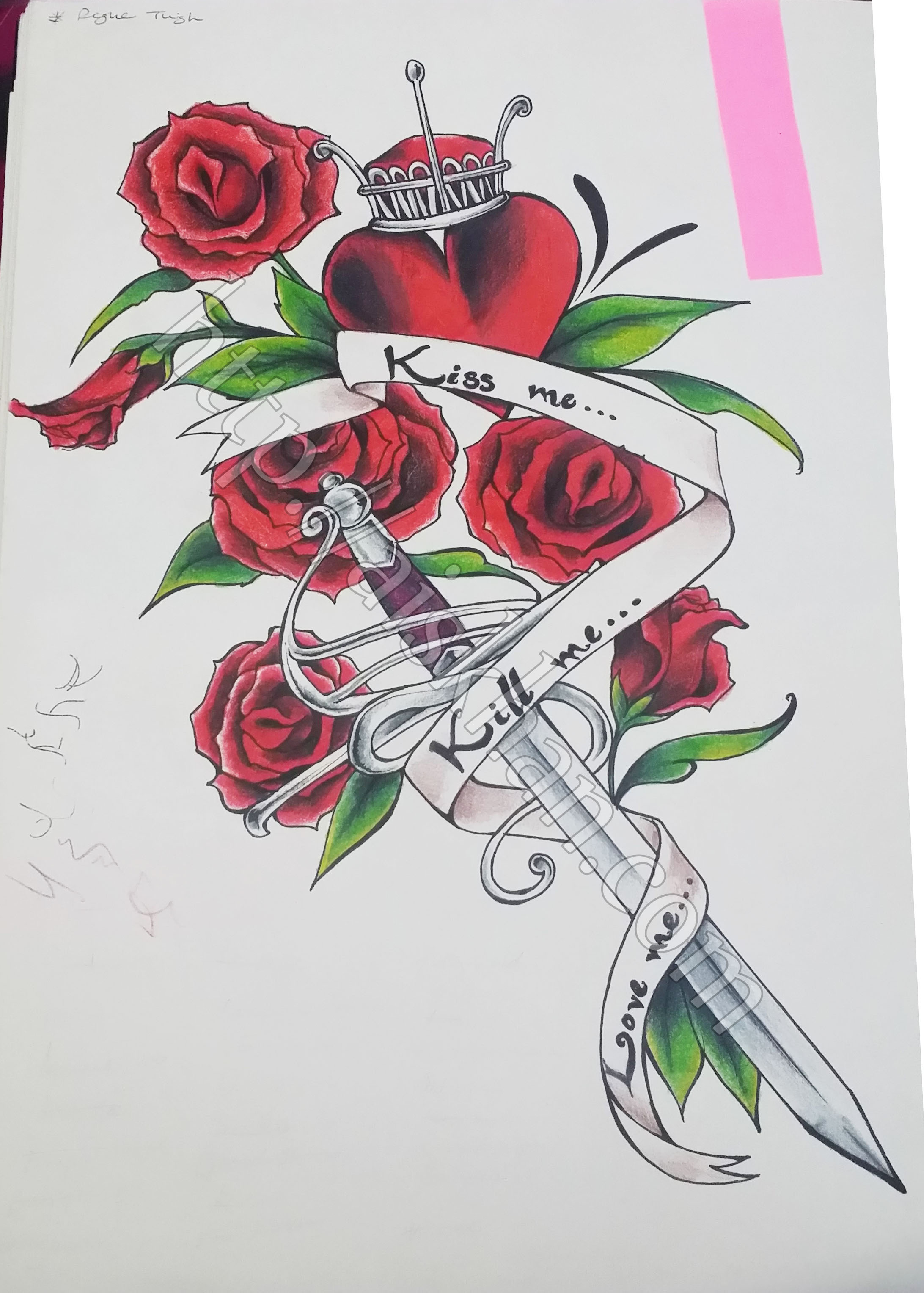 If I were to ever get a thigh piece done (which I would like to) I’d have to start from scratch, I like the positioning, the flowers, but I’d replace the dagger with a bone, most likely a thigh bone.