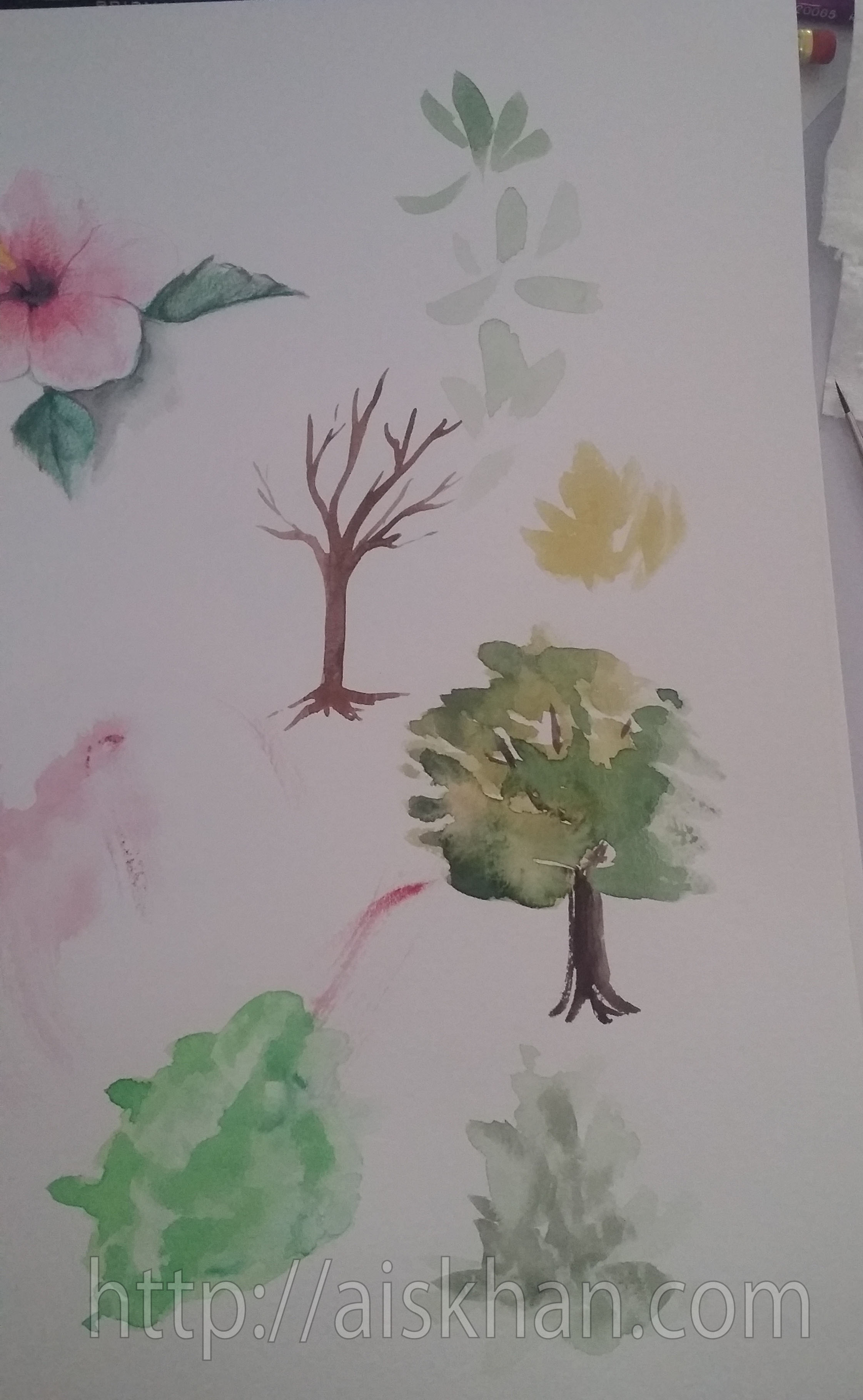 Exploring watercolour paints. Trying to see if I can draw decent looking leaves. Also testing some colour palettes down there on that one page.