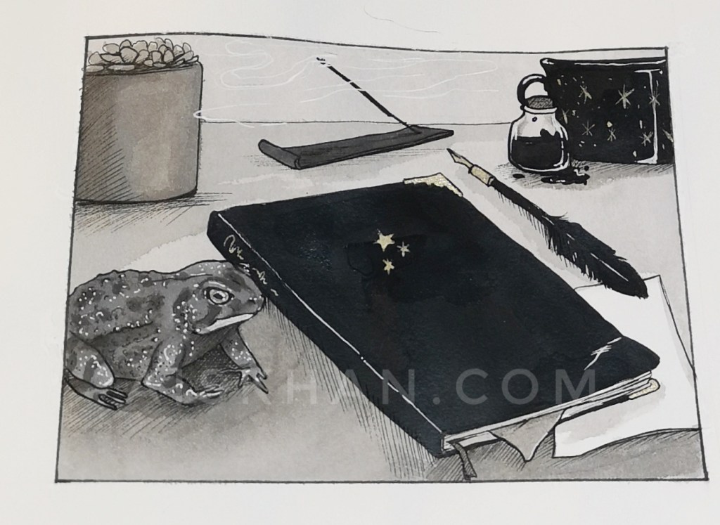 Some people’s book of shadows are more understated than others so I tried to draw a worn looking notebook with light embossing. I drew a toad for the familiar and I think, while he looks mad, he turned out nicely.