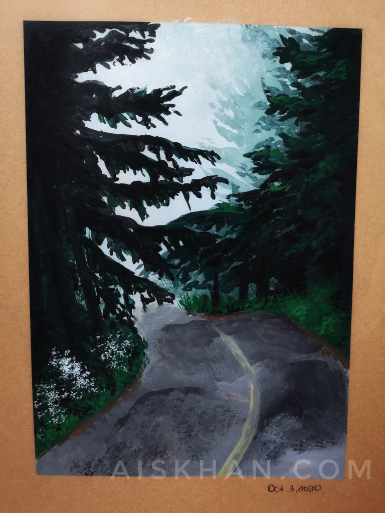 Started a new sketchbook (back in July) and finally figured out what I wanted to do on the cover. The trees and sky came out beautifully, but you can see where I gave up, on the road. But that’s okay, because this is just a sketchbook and this was just for fun.